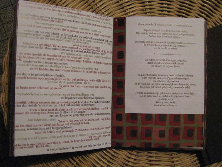 En hier is mijn praal stukje. Mijn boek. Ik heb er dus twee, één met bruine kaft en de andere met papieren kaft. Het inbinden is wel niet perfect gegaan, want moet nog zien dat het binnenwerk goed vastzit aan de kaft, dat is wat losgekomen. Blader er maar eens rustig door.
